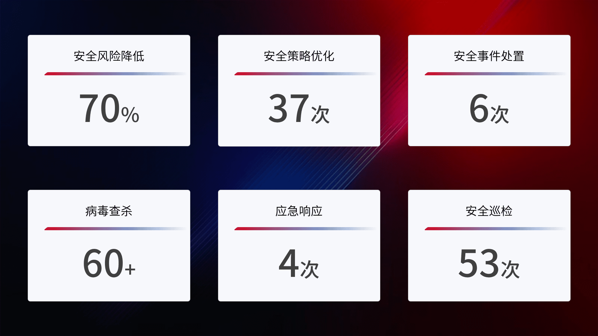 提供全面的安全事件报告体系,,,,包括处置报告、、、周报、、、季度和年度总结,,结合持续监控,,帮助客户深入了解网络安全状况。。